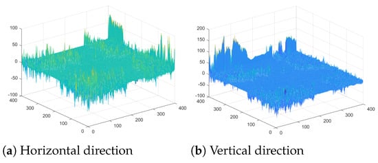 In order to overcome this drawback, in 2018, Song et al. proposed a weighted dual sparsity unidirectional variation (WDSUV) model based on the sparse characteristics of the spatial and gradient domains of stripe noise, which adopted different processing strategies for heavy stripe regions, extreme regions, and regular noise destruction regions []. In 2022, Song et al. proposed an enhanced prior combining double low-rank attributes, and combined this prior information with a total variational model, which not only effectively removed banding noise but also did not produce the “staircase effect” []. In addition, researchers have developed the high-order variational model. The well-known TVBH (TV bound Hessian) model [] combined first-order variational and second-order variational, which not only achieved a better stripe noise removal effect but also prevented the “staircase effect” generated by the first-order variational model. In 2020, Yang et al. proposed a stripe removal model based on Schatten 1/2 norm regularization to describe the low rank of stripes, and based on UTV and unidirectional higher-order total variational (UHTV) regularization to ensure the smoothness of the underlying image and reduce the “staircase effect” []. Although the high-order variational model effectively overcomes the “staircase effect”, it uses a fixed fractional order for the image, making it difficult to make good adjustments to all parts of the image.