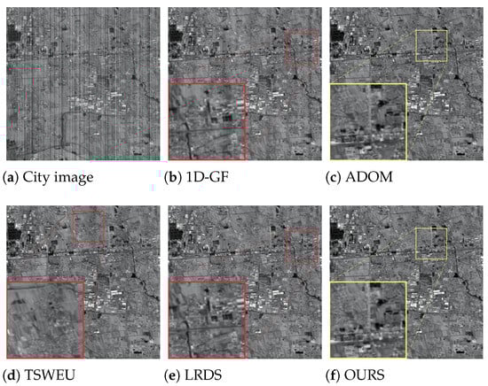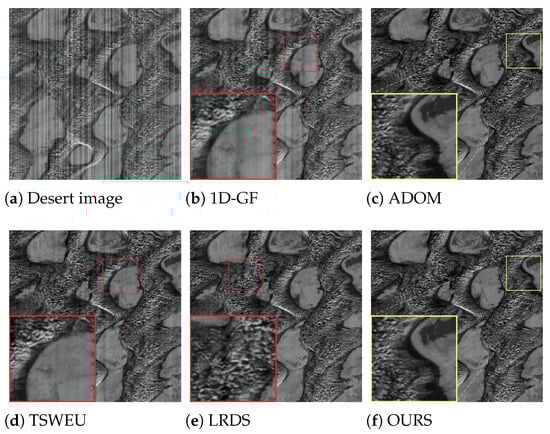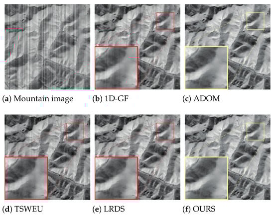 In this section, three infrared remote sensing image scenes with different grayscale and contrast are selected for experimental comparison, namely the mountain image, the city image, and the desert image. In this paper, non-periodic stripe noise with a noise ratio of 0.6 and intensity of (−60∼60) is added to the images, which is relatively close to actual stripe noise. The actual information images obtained by each algorithm after striping are shown below. The small red and yellow boxes represent part of the image area, and the large red and yellow boxes represent part of the image area that has been enlarged.