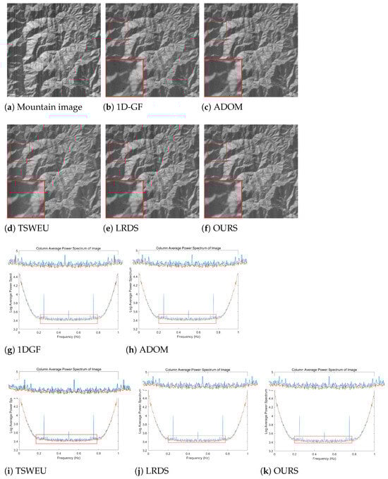 In this section, four actual infrared remote sensing image scenes with different grayscale and contrast are selected for experimental comparison, namely the mountain image, the building image, the cloud image, and the city image. The actual information images and the row average power spectral density graphs obtained before and after striping by each algorithm are shown below, with the abscissa as the normalized frequency and the ordinate as the average power spectrum of all rows; the blue and red curves represent the power spectral density of the original image and the denoised image, respectively. In the comparison graph of the row average power spectral density, the enlarged portion of the contrast curve is in the red rectangle box shown at the top. There are obvious blue spike pulses in the original image at a certain frequency, indicating that the original image contains some stripe noise. The reduction in red pulses after denoising can indicate that stripe noise has been eliminated to a certain extent, and the presence of smaller red pulses indicates that residual stripe noise has not been completely eliminated [].