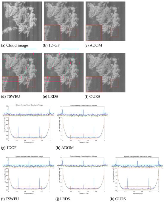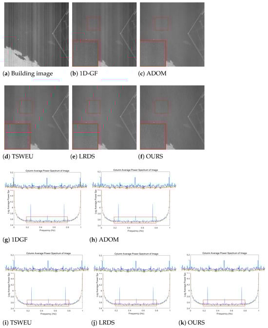 As shown in Figure 13, Figure 14, Figure 15 and Figure 16, compared with other methods, 1-D GF has the worst denoising effect. Although it preserves the edges and details, it is difficult to completely remove stripe noise in actual images. There is a certain amount of noise residue in the red square box. Moreover, small red pulses still present at the positions of larger blue pulses in the power spectral density graphs, which also indicates that some of the stripe noise has not been removed. ADOM performs well on the power spectral density graphs, with only very small spike pulses. ADOM can basically remove the majority of stripe noise, but there is a phenomenon of edge area pixels being excessively smoothed in the denoised images.