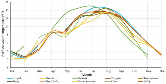 3.2. Water Temperature in the Tisza River and Its Daily Cycle (In Situ Data)