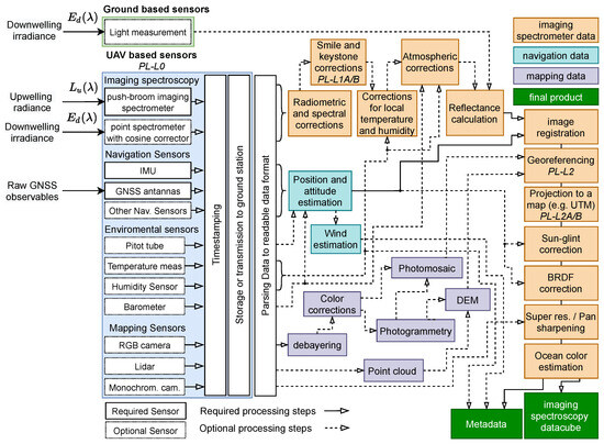 Commercial software used in remote sensing and imaging spectroscopy, such as ENVI 5.6, typically require calibrated and georeferenced datacubes as input. The processing software to obtain such a datacube is normally proprietary and comes with the procured imaging spectrometer hardware. Scientific publications related to hyperspectral data processing normally also refer to the processing and analysis of the calibrated and georeferenced hyperspectral datacube and not the low-level processing steps to obtain such a data product. Scientific publications related to obtaining a hyperspectral datacube with DIY imaging spectrometer designs and payloads are sparse. There are very few publications available that are specifically related to UAVs [13,14,15,16]. Most of the publications that do exist are related to other platforms, e.g., satellites [27,28] or focus only on a few selected processing steps. A comprehensive and complete approach to creating a calibrated and georeferenced remote sensing reflectance datacube from raw data is missing in the scientific literature. Figure 1 represents a general approach to UAV-based imaging spectroscopy, showing the data gathering with UAV-based sensors in blue on the left, and the final product on the bottom right (green). The data Processing Levels, such as PL-L1 A/B to PL-L2 A/B in Figure 1, are rendered according to the processing levels used by ESA and NASA (data processing levels (accessed on 7 June 2024): https://www.earthdata.nasa.gov/engage/open-data-services-and-software/data-information-policy/data-levels).