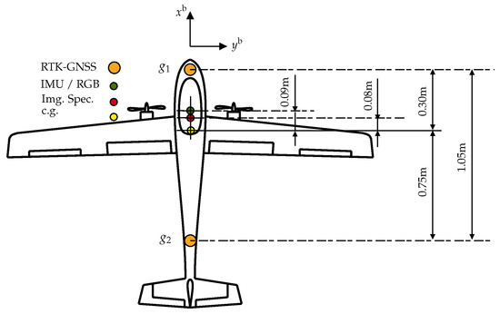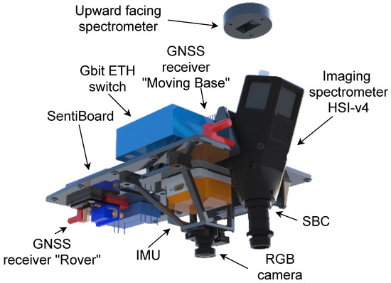 Figure 3 shows a comprehensive layout of the payload components and their integration into the described remote sensing payload. The payload design presented in this paper is a significant improvement compared to the payload used in [13,14]. Key enhancements include the mechanically more rigid integration of the imaging spectrometer and the IMU into the payload frame (see Figure 2), which significantly reduces a major source of georeferencing uncertainty identified in [14]. Additionally, the direct integration of an RGB camera into the payload offers much greater situational awareness. The incorporation of an additional RTK-GNSS receiver further augments the precision of the state-estimation and thus enhances the accuracy of the directly georeferenced datacube. All this is complemented with a lighter and less power-hungry single Board Computer (SBC), and increased storage capacity. In the following sections, the most important components of the payload are described in more detail.