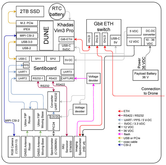 The data from all sensors is stored on a Solid State Drive (SSD) with a capacity of 2 . An Ethernet switch allows the payload to interface with the drone’s radio link, and through it, with an operator on the ground. These and all other components are schematically shown in Figure 3. The payload operator has the ability to modify the payload settings during operation in real-time through LSTS-NEPTUS [38] and monitor the data capturing process. This allows for remote control and a flexible mission execution, with on-the-fly adjustment of remote sensing parameters as well as the UAV flight plan. Furthermore, it is a stepping stone to closer integration, interoperability, and autonomy between robotic agents.