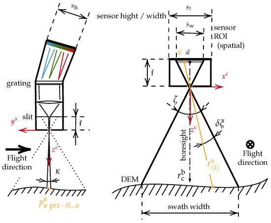 Imaging spectrometer pinhole camera model, with along-track view to the left and cross-track view to the right.