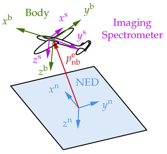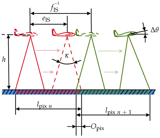 Image quality for airborne push-broom imaging spectrometers depends on the interplay between speed over ground v, altitude above the imaged surface h, UAV pitch rate , imaging spectrometer frame rate ( is the frame interval), and exposure time . Figure 6 shows the push-broom imaging from the side and from the back. The along track and the across track are visualized in this image.
