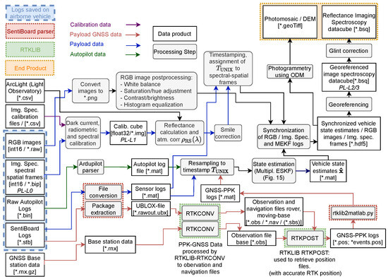 The following section elaborates on the onboard and offline data processing pipeline. A complete overview of the data processing pipeline for all sensors as it was implemented for the described UAV payload is shown in Figure 8. Much of the data processing steps shown in Figure 8 were performed offline. These processing steps are further discussed in Section 5, Section 6 and Section 7.