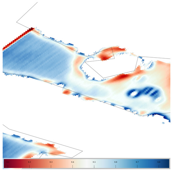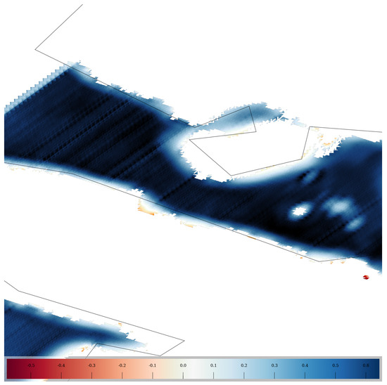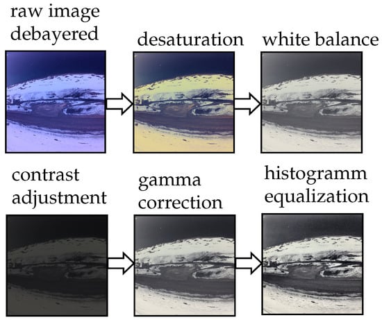 Due to varying lighting conditions and the camera’s internal drivers reacting to it, the RGB image quality varied widely within one flight. Addressing these inconsistencies during post-processing posed considerable challenges. The post-processing steps which are shown in Figure 9 resulted in the best image quality and the least color variations between consecutive image captures. Figure 10 shows an orthophoto generated with color-corrected images and the software Open Drone Map (ODM) version 3.5.3 [43].