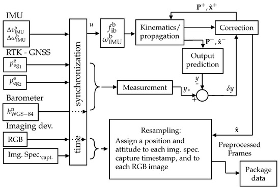 The payload presented was deliberately designed without a gimbal. In this way, a weight- and energy-saving design can be achieved. The reduced mechanical complexity, however, places high demands on precise state estimation, which furthermore must be precisely synchronized to the imaging spectrometer frame captures.