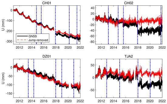 In our study, missing entries in the GNSS vertical displacement data are not interpolated. Due to events such as earthquakes and antenna replacements, some GNSS displacement time series exhibited anomalous jumps. To address these irregularities in GNSS time series with variable rates, we employed a tool designed for change detection within unequally spaced and non-stationary time series, named the Jumps upon Spectrum and Trend (JUST) [32]. The JUST tool is highly effective for estimating trends and seasonal components in both equidistant and non-equidistant time series, accounting for observational uncertainties and measurement errors. Built on the foundations of least-squares spectral analysis (LSSA) and anti-leakage LSSA (ALLSSA), JUST excels at detecting jumps in the trend component of time series. This makes it particularly well-suited for scenarios manifested as jumps in a time series with changing rates. In our study, we utilized the default parameter settings to address jumps in the GNSS vertical displacement time series [32,33]. Figure 2 presents the results for four GNSS stations (CH01, CH02, DZ01, and TJA2) that exhibited significant jumps. For example, five jumps were detected at CH01, with the maximum jump of 26.7 mm. The results indicate that the GNSS vertical displacement time series, after applying the JUST method to handle jumps, exhibits a more continuous change pattern.