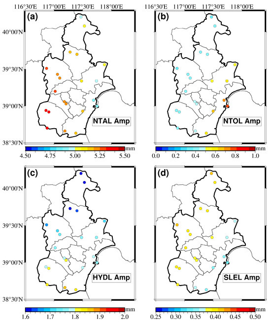 Annual variation characteristics of vertical deformation of various loading models at GNSS stations. (a–d) indicate annual amplitude of vertical displacements regarding NTAL, NTOL, HYDL, and SLEL, respectively.