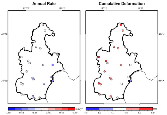To demonstrate the spatial differences in subsidence across various GNSS stations, the accumulated displacements and rates recorded by 17 stations with relatively complete time series are shown in Figure 6. The study results indicate that most sites in Tianjin experienced subsidence during the observation period. However, no significant surface subsidence was observed at three stations in northern Tianjin (CH02, JIXN, TJA2). Groundwater extraction in northern Tianjin primarily took place in the unconfined aquifers [26], which allows for rapid replenishment by water transferred from the south and rainfall during wetter years.
