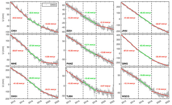 We calculate the subsidence rates at nine critical GNSS stations in Tianjin (CH01, DZ01, JHAI, NIHE, PANZ, QING, SW01, TJBH, and WQCG) in Figure 7. These stations were chosen to assess the impacts of the initiation of the Middle Route of the South-to-North Water Diversion Project (December 2014) on subsidence rates. The analysis shows slowing subsidence rates across these stations, particularly after 2018.