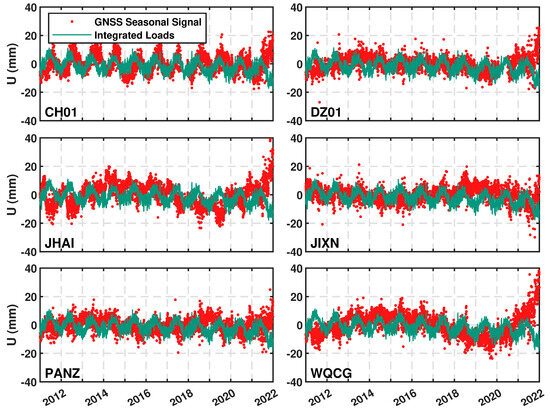 Seasonal deformation signals of load-corrected (red dots) and model-predicted (green lines) vertical deformations at six stations.