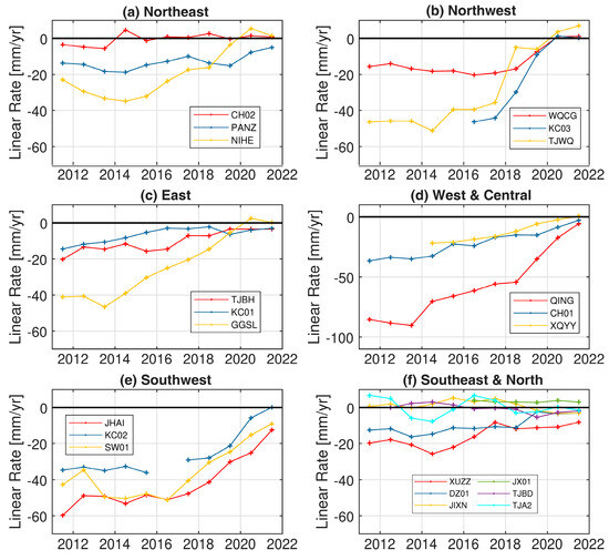 We analyzed the annual linear rates of ground movement across various regions in Tianjin. Initially, we applied least squares regression (see Section 3.3) to the data, isolating and removing the seasonal component of the jump- and model-corrected time series. To minimize high-frequency noise in the residual time series, we implemented a 4-degree Butterworth filter. Finally, we recalculated the annual linear rates using a two-year sliding window to ensure robust estimates. Figure 9 provides a detailed illustration of the linear rate variations across these 21 stations. Note that the black horizontal lines in Figure 9 mark the boundary between positive (uplift) and negative (subsidence) rates. The results reveal that all stations (except JIXN, TJBD, and TJA2 in Figure 9f) with long-term subsidence experienced a slowdown in subsidence rates in recent years.