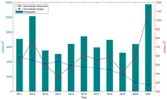 Annual groundwater resources (red line), groundwater supply (blue), and precipitation (green bars) in Tianjin from 2011 to 2021.