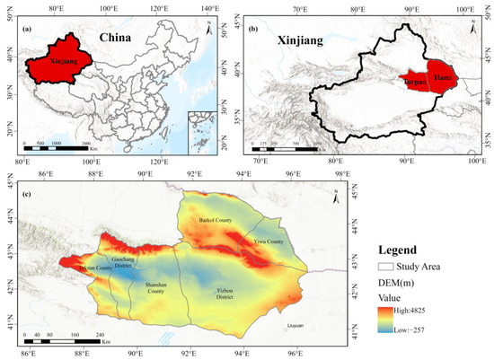Location of the study area. (a) Location of Xinjiang in China; (b) location of the Turpan and Hami regions in Xinjiang; (c) Turpan and Hami districts and counties with DEM data.