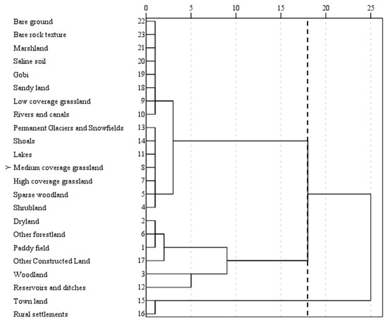Cluster analysis is a crucial tool for quantitative research in the classification of geographical entities and regional zoning, as it enables the analysis and expression of regional differences through the calculation of multi-factor similarities [40,41]. In this study, a hierarchical clustering method is employed to identify the thematic functions of land use types, allowing for a deeper understanding of the spatial distribution characteristics and similarity patterns of various land use types. This approach effectively reveals the functional differences between regions, providing a scientific basis for land use management and regional planning. The formula is presented as follows: