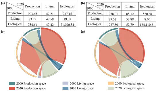 Spatial and temporal changes in the PLESs in the Turpan and Hami regions, 2000–2020. (a) Land use transfer table for the Turpan region; (b) land use transfer table for the Hami region; (c) PLES transfer chord map of the Turpan region; (d) PLES transfer chord map of the Hami region.