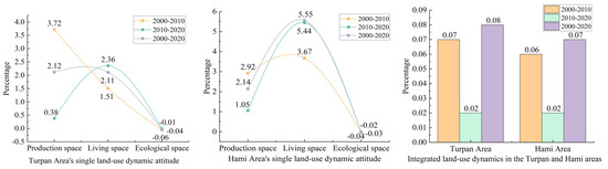 Based on the analysis of PLES changes in the Turpan and Hami regions in 2000, 2010 and 2020, the total areas of the Turpan and Hami regions are approximately 74,000 km2 and 137,200 km2, respectively; furthermore, the area shares of each category of PLES are similar. Over the past 20 years, with the rapid development of the Turpan and Hami regions, there have been significant changes in land use types within the area. Ecological space remains the predominant land use type, accounting for 97% of the total area. However, its area has gradually decreased from 208,253 km2 in 2000 to 206,908 km2 in 2020, with a total reduction of 1344 km2. In contrast, production and living spaces have shown a continuous growth trend during this period. The area of production space has increased by 1215 km2, expanding from 2851 km2 to 4067 km2, representing 2% of the total area. Meanwhile, living space has increased by 142 km2, from 190 km2 to 333 km2, accounting for 1% of the total area. These changes reflect the dynamic adjustment and transformation of land use patterns against the backdrop of rapid regional economic development. This is mainly due to the rapid development of industrialization and urbanization as well as the expansion of agricultural production, which has resulted in the large-scale removal of natural vegetation and the encroachment of ecological space (Figure 3). Figure 4 shows the change in PLES land use motivation attitudes in the Turpan and Hami regions from 2000 to 2020. The results of the study revealed that the motivations for the change trends of single land use in the Turpan and Hami regions over 20 years were the same. The value of production space was the largest value during 2000–2010, indicating that the change in production space was greater in this period; the value of living space increased significantly in the latter 10 years, and the change was more obvious. However, the value of ecological space changed by only 0.04, mainly because 97% of the area in this region was ecological space, the base was larger, and the change was not obvious. In terms of the attitudes toward integrated land use dynamics, the values for the Turpan and Hami regions from 2000 to 2010 were 0.07% and 0.06%, respectively, and both decreased to 0.02% from 2010 to 2020, with a low degree of integrated land use. This situation occurred because the geomorphological types in the study area are dominated by sandy and bare rocky terrain that is unsuitable for human habitation, whereas oases and plains are small in size, resulting in significant land use conflicts.