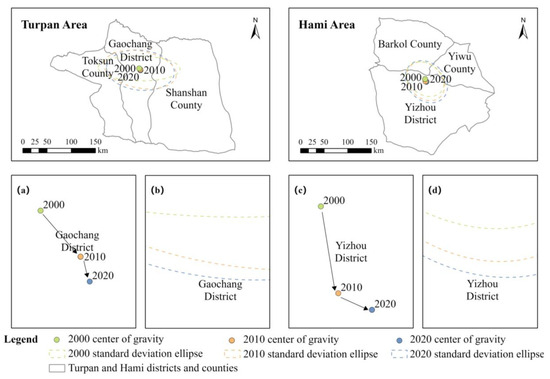 Spatial distribution of the shift in the center of gravity of living space from 2000 to 2020. (a) Center of gravity trajectory of Turpan; (b) standard deviation ellipse of Turpan; (c) Center of gravity trajectory of Hami; (d) standard deviation ellipse of Hami.