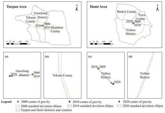 Spatial distribution of the shift in the center of gravity of production space from 2000 to 2020. (a) Center of gravity trajectory of Turpan; (b) standard deviation ellipse of Turpan; (c) Center of gravity trajectory of Hami; (d) standard deviation ellipse of Hami.