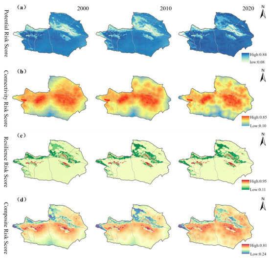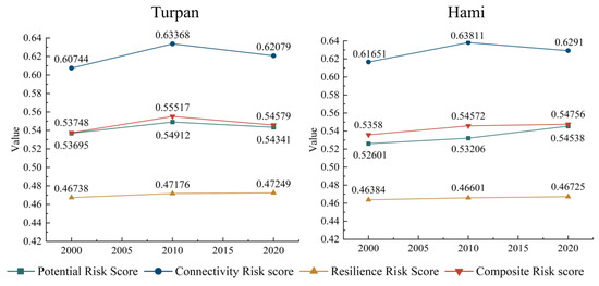 Ecological risk can clearly reflect the degree of superiority or inferiority of the environmental conditions of ecosystems. In this study, on the basis of the proposed ecological risk evaluation method, different types of ecological risk scores were calculated and analyzed three times: in 2000, 2010 and 2020. As shown in Figure 8, the potential risk, connectivity risk, resilience risk and comprehensive risk of the Turpan and Hami regions changed significantly during the period of 2000–2020, and the area of high-risk areas gradually increased, which makes it necessary to reduce the ecological risk and improve the ecological and environmental conditions of the region.
