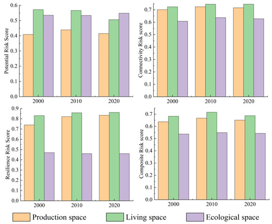 - This study revealed that over 20 years, the average values of various PLES risks were as follows: living space > production space > ecological space. This indicates that the risk values are greater in the more densely populated living spaces, primarily because of the homogeneous landscape types, low vegetation cover, high population density, and significant human disturbance in these areas, resulting in higher risk values.