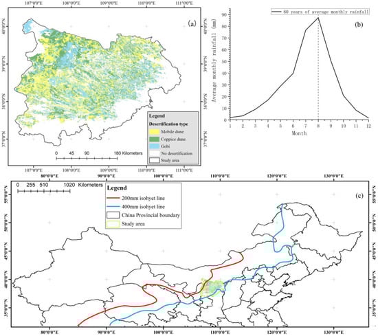 (a) Desertification types in the study area; (b) annual mean monthly precipitation in the study area; (c) location of the study area in a semi-arid region of China.