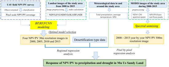 It is important to note that the spatial resolution of MODIS data, which is greater than 250 m, may result in inaccurate analysis of NPV and PV in the Mu Us desert area, where shrub desertification is predominant. Consequently, a key focus of this study is to develop NPV and PV estimation models using Landsat series imagery through machine learning techniques.
