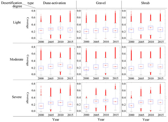 The NPV and PV retrieved by the RF model for the years 2000, 2005, 2010, and 2015 are presented in Appendix A Figure A3, Figure A4, Figure A5 and Figure A6, with box plot statistics segmented by different types of desertification displayed in Figure 3 and Figure 4 of the main text. The images from top to bottom represent light, moderate, and severe desertification, while the images from left to right represent different types of desertification. The red symbols in the figures represent outliers that exceed the overall distribution by a factor of 1.5 quartiles.