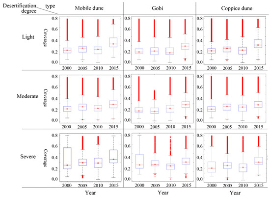 Box plot of photosynthetic vegetation coverage of different desertification types and degrees.