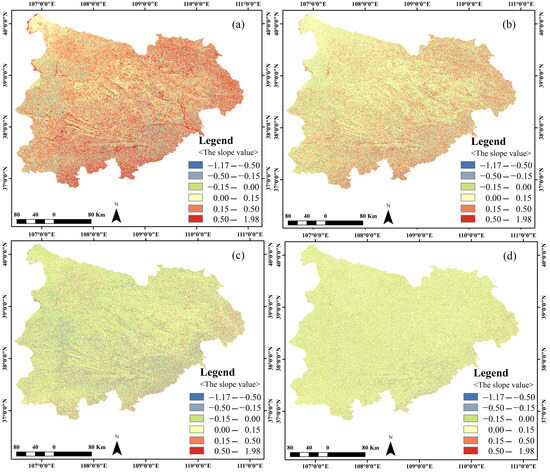 The time series linear regression analysis of NPV, PV coverage, and precipitation from MODIS data revealed a discernible trend, but with a significant gap between adjacent pixels. For the MODIS43 data product used by Guerschman et al. [16], the effect of such noise points was significant after smooth filtering, and they should not still be present in the results of this study. However, as shown in Figure 10, there are still some noise points (blank pixels in Figure 10a,c) with different positions in MODIS NPV and PV coverage for two consecutive years.