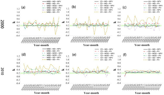 (a) Time-Lagged Response of NPV and PV to Monthly Precipitation on mobile dune desertification during Dry Years. (b) Time-Lagged Response of NPV and PV to Monthly Precipitation on coppice dune desertification during Dry Years. (c) Time-Lagged Response of NPV and PV to Monthly Precipitation on Gobi desertification during Dry Years. (d) Time-Lagged Response of NPV and PV to Monthly Precipitation on mobile dune desertification during Wet Years. (e) Time-Lagged Response of NPV and PV to Monthly Precipitation on coppice dune desertification Wet Years. (f) Time-Lagged Response of NPV and PV to Monthly Precipitation on Gobi desertification Wet Years. Figure note: MBD represents mobile dune desertification; CD represents coppice dune desertification; GD represents Gobi desertification; MD represents mild desertification; MOD represents moderate desertification; and SD represents severe desertification. K is the response degree of NPV and PV to precipitation in the desertification type and degree region.