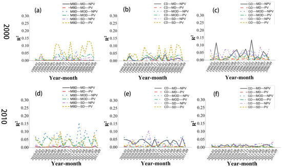 (a) Time-delay correlation (R2) of NPV and PV to Monthly Precipitation on mobile dune desertification during Dry Years. (b) Time-delay correlation (R2) of NPV and PV to Monthly Precipitation on coppice dune desertification during Dry Years. (c) Time-delay correlation (R2) of NPV and PV to Monthly Precipitation on Gobi desertification during Dry Years. (d) Time-delay correlation (R2) of NPV and PV to Monthly Precipitation on mobile dune desertification during Wet Years. (e) Time-delay correlation (R2) of NPV and PV to Monthly Precipitation on coppice dune desertification Wet Years. (f) Time-delay correlation (R2) of NPV and PV to Monthly Precipitation on Gobi desertifi-cation Wet Years. Figure note: MBD represents mobile dune desertification; CD represents coppice dune desertification; GD represents Gobi desertification; MD represents mild desertification; MOD represents moderate desertification; and SD represents severe desertification. R2 is the correlation.