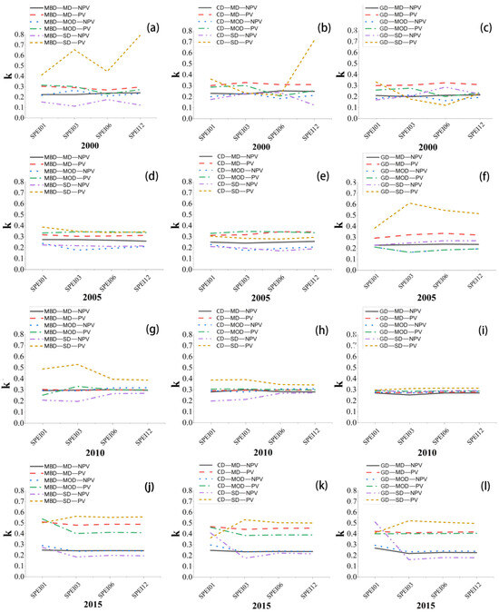 (a) Response of NPV and PV to SPEI on mobile dune desertification in the Year 2000. (b) Response of NPV and PV to SPEI on coppice dune desertification in the Year 2000. (c) Response of NPV and PV to SPEI on Gobi desertification in the Year 2000. (d) Response of NPV and PV to SPEI on mobile dune desertification in the Year 2005. (e) Response of NPV and PV to SPEI on coppice dune desertification in the Year 2005. (f) Response of NPV and PV to SPEI on Gobi desertification in the Year 2005. (g) Response of NPV and PV to SPEI on mobile dune desertification in the Year 2010. (h) Response of NPV and PV to SPEI on coppice dune desertification in the Year 2010. (i) Response of NPV and PV to SPEI on Gobi desertification in the Year 2010. (j) Response of NPV and PV to SPEI on mobile dune desertification in the Year 2015. (k) Response of NPV and PV to SPEI on coppice dune desertification in the Year 2015. (l) Response of NPV and PV to SPEI on Gobi desertification in the Year 2015. Figure note: MBD represents mobile dune desertification; CD represents coppice dune desertification; GD represents Gobi desertification; MD represents mild desertification; MOD represents moderate desertification; and SD represents severe desertification. K is the response degree of NPV and PV to precipitation in the desertification type and degree region.