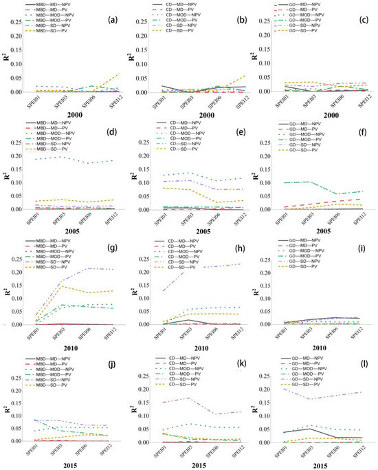 (a) Correlation of NPV and PV to SPEI on mobile dune desertification in the Year 2000. (b) Correlation of NPV and PV to SPEI on coppice dune desertification in the Year 2000. (c) Correlation of NPV and PV to SPEI on Gobi desertification in the Year 2000. (d) Correlation of NPV and PV to SPEI on mobile dune desertification in the Year 2005. (e) Correlation of NPV and PV to SPEI on coppice dune desertification in the Year 2005. (f) Correlation of NPV and PV to SPEI on Gobi desertification in the Year 2005. (g) Correlation of NPV and PV to SPEI on mobile dune desertification in the Year 2010. (h) Correlation of NPV and PV to SPEI on coppice dune desertification in the Year 2010. (i) Correlation of NPV and PV to SPEI on Gobi desertification in the Year 2010. (j) Correlation of NPV and PV to SPEI on mobile dune desertification in the Year 2015. (k) Response of NPV and PV to SPEI on coppice dune desertification in the Year 2015. (l) Response of NPV and PV to SPEI on Gobi desertification in the Year 2015. Figure note: MBD represents mobile dune desertification; CD represents coppice dune desertification; GD represents Gobi desertification; MD represents mild desertification; MOD represents moderate desertification; and SD represents severe desertification. R2 is the correlation.