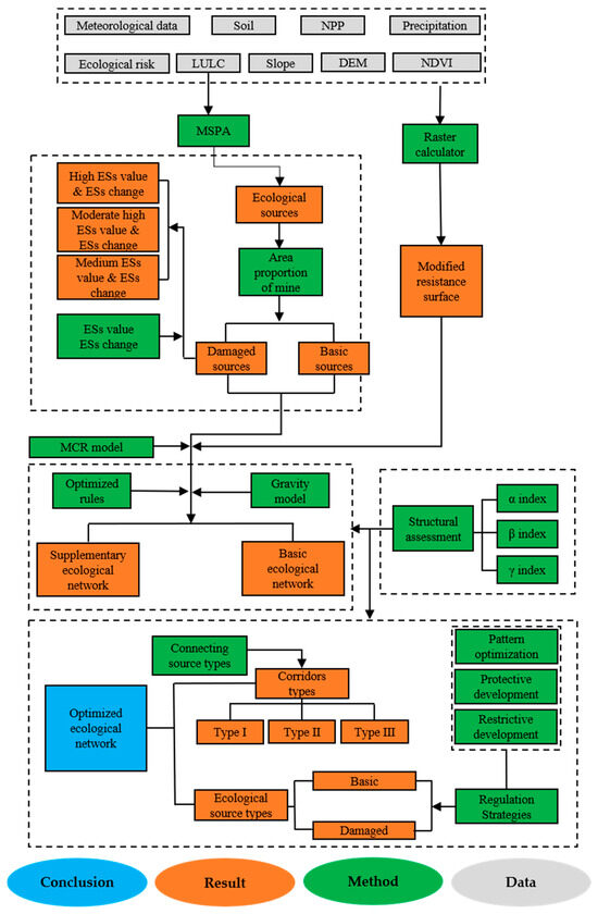 The methodological framework is shown in Figure 2. This study emphasized ecological networks using ecological sources and connecting corridors to quantify the effects of damaged ecological sources participating in ecological networks and optimize the regional ecological landscape pattern. Further, regulation strategies were proposed for ecological sources. The methodological framework of our analysis can be divided into three parts. The first stage was to extract and divide ecological sources. The ecological sources were identified using the MSPA method and classified into basic sources and damaged sources based on the proportion of mining areas and buffer zones in the ecological sources; damaged ecological sources were classified in terms of the importance and change in ecological services. Secondly, a system of factors of resistance surfaces was constructed, and the resistance value of land cover was revised using the ecological risk index. Using basic ecological sources, the basic ecological network was determined through the MCR model, and damaged sources of different levels were employed to construct supplementary ecological networks. Thirdly, based on the gravity model and specific rules, different-level supplementary ecological networks were integrated into the basic ecological network. The changes in structural characteristics (α, β, γ) were used to evaluate the effect of stepwise ecological network construction. Finally, specific regulation strategies were adopted for ecological sources with different connection modes.