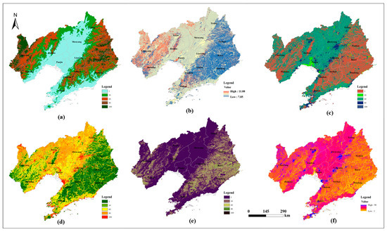 Resistance surface of every factor and modified comprehensive resistance surface. (a) represents the resistance surface of DEM; (b) represents the ecological risk index based on the land cover; (c) represents the resistance surface of land cover; (d) represents the resistance surface of vegetation coverage; (e) represents the resistance surface of the slope; and (f) represents the modified resistance surface.
