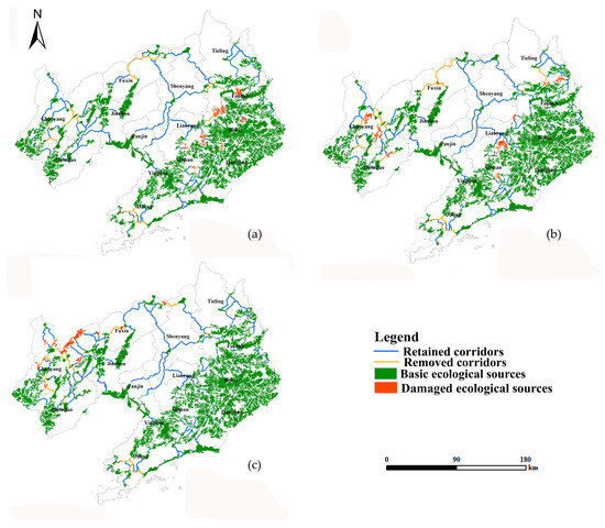 The removed corridors and their reasons for removal are given in Tables S4–S6, Figure S7, and S9–S11. 67 ecological corridors were supplemented. In the first iteration, 9 ecological sources and 17 ecological corridors were added in the eastern areas, such as Fushun city, Benxi city, Liaoyang city, Dandong city, and Anshan city (Figure 7a). The details of the local ecological networks were further enriched. In the second iteration, 9 ecological sources and 25 ecological corridors were supplemented (Figure 7b). In particular, 4 sources were filled in the ecological network of Chaoyang City, Huludao City, and Fuxin City. These patches were used as stepping stones in the local ecological network. In the third iteration, 10 ecological sources and 25 ecological corridors were supplied (Figure 7c). Among them, 8 sources were added to the ecological network in Chaoyang city, greatly enriching the local ecological network, and 2 sources were supplemented in the ecological network in Fuxin city to cut off overly long corridors.