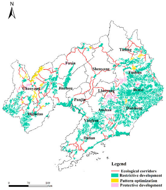 According to the integrated ecological network and its elements, this study proposed three regulation strategies: pattern optimization, protective development, and restrictive development for ecological sources with three connection types (Figure 9).
