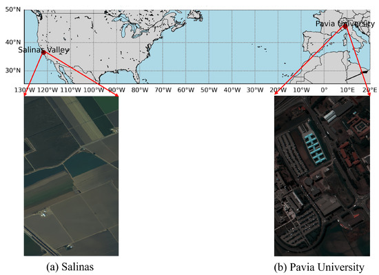 This study utilized two publicly available hyperspectral image datasets: Pavia University and Salinas Datasets. The two datasets are extensively used in various fields related to HSI experiments, such as classification and clustering [27,28,29,30]. The scene images of the two datasets are depicted in Figure 1.