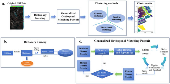 In this section, we introduce the application of the GOMP algorithm for sparse representation in HSI clustering. As shown in Figure 2, the overall process consists of three main stages: dictionary learning, GOMP sparse coding, and clustering analysis. First, in the dictionary learning stage, a dictionary is trained using HSI data. The goal is to minimize the reconstruction error, resulting in a dictionary that compactly represents the key features of the data. This dictionary is then used in the subsequent sparse coding step. In the GOMP sparse coding stage, the GOMP algorithm iteratively selects dictionary atoms in a greedy manner to reduce residuals, thus achieving a sparse representation of the data. This process involves initializing the sparse matrix, selecting a sample, setting up the residual and support set, and updating the sparse matrix, repeating these steps until all pixels are processed. Finally, the sparsely coded data are applied to various clustering methods, such as K-means clustering, hierarchical clustering, and spectral clustering, to evaluate the enhancement in clustering performance achieved by the GOMP. This approach, by integrating dictionary learning and sparse representation, simplifies the dimensionality of data while preserving important global structural information, which significantly enhances the effectiveness of clustering analysis.