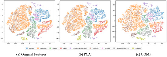 Figure 3 presents the t-SNE visualization results for the Pavia dataset, from which we can observe the impact of different feature extraction techniques on clustering outcomes. The distribution of data with original features displays blurred class boundaries, reflecting the intrinsic complexity and overlap among categories in high-dimensional data. This blurriness makes accurate clustering challenging, as closely related categories may be difficult to distinguish in the feature space. When PCA is applied for feature extraction, an improvement in the differentiation between categories is observed, although many boundaries remain ambiguous. This indicates that while PCA can reduce the dimensionality of data and remove noise to some extent, its capacity is limited in handling highly overlapping categories. In contrast, the feature extraction process of the GOMP demonstrates a significant advantage. Data processed by the GOMP shows a more distinct and separated category distribution in the t-SNE visualization, suggesting that the GOMP not only effectively reduces the dimensionality of the data but also enhances the separability between categories. This is a key attribute for an effective clustering analysis, as good class separation aids clustering algorithms in more accurately identifying different categories.
