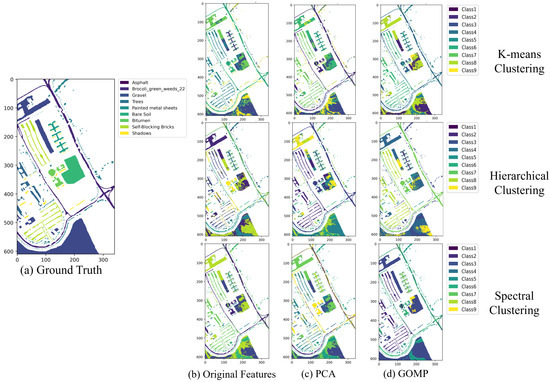 Table 2 presents a detailed clustering accuracy table that thoroughly compares three clustering algorithm—K-means, hierarchical, and spectral clustering—across the Pavia University and Salinas datasets. These comparisons are based on data processed using original features, PCA, and GOMP. The main evaluation metrics are the RI and NMI, which provide measures of the clustering quality by assessing the similarity of the clustering outcomes to the ground truth and quantifying the mutual information between the clustering results and the actual labels, respectively.