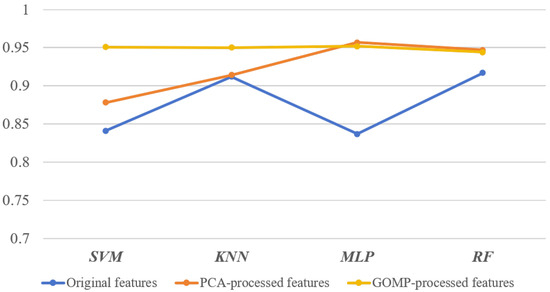 The classification accuracy results, illustrated in Figure 11, show that GOMP-processed features consistently lead to higher classification accuracy compared to the original features. Additionally, GOMP-processed features are competitive with, or even outperform, PCA-processed features across all classifiers. For instance, the SVM classifier achieves an accuracy of 0.951 with GOMP-processed features, a significant improvement over the 0.841 accuracy with original features. The KNN and MLP classifiers similarly show strong performance, with accuracies of 0.950 and 0.952, respectively, when using GOMP-processed features.