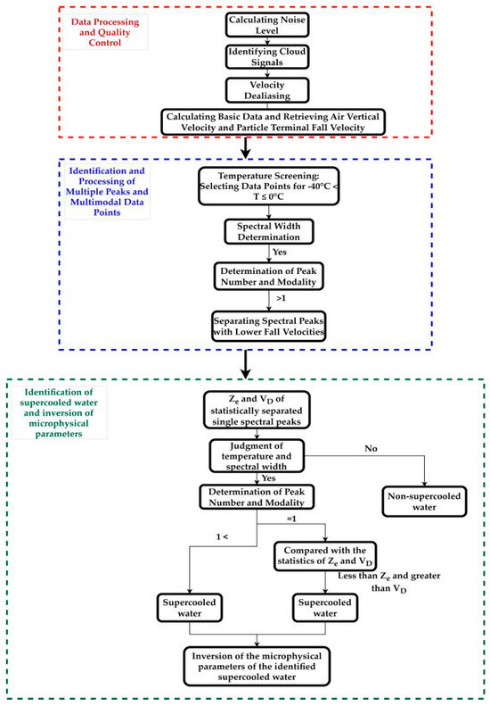 The presence of supercooled water in clouds is often accompanied by particles such as ice crystals, whose fall speed differences can result in multiple peaks in the radar power spectrum [18]. Therefore, this feature can serve as an effective basis for identifying supercooled water. Based on this characteristics, combined with the radar reflectivity factor and mean Doppler velocity, this paper proposes a new algorithm for identifying supercooled water. The flowchart and specific algorithm description are shown in Figure 2.