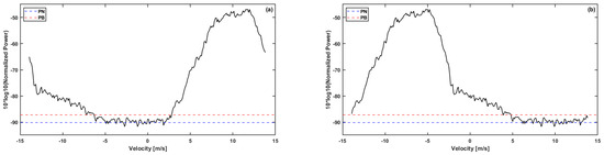 Figure 3. Radar power spectra detected at 4.2 km by the Tulihe radar at 13:45 on 18 May 2023. (a,b) are the original and corrected spectra, respectively. - Calculate Radar Base Data through Local Integration: This includes echo power Pr (dBm), reflectivity factor Ze (dBZ), mean Doppler velocity VD (m/s), and spectral width σv (m/s). The calculation formulae are shown in Equations (1)–(5). Here, vs and ve are the Doppler velocities (m/s) at the start and end points of the cloud and rain signals, Pi is the power of the cloud and rain signals (dBm), PN is the noise level (dBm), and C is the radar constant.
