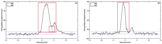 Radar power spectra detected at 3.75 km and 3.85 km by the Tulihe radar at 13:10 on 18 May 2023 (Beijing time, the same below). (a,b) represent the cases of multimodal peaks and multiple modes, respectively.