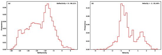- Correct Velocity Ambiguity: When cloud and rain are strong, velocity ambiguity occurs, shown as some cloud and rain signals exceeding the maximum velocity values on both sides of the power spectrum and folding back (as shown in Figure 3a). To avoid the impact of this issue on the accuracy of subsequent microphysical parameter retrieval, we use the de-aliasing method proposed by Zheng et al. [20]. This method corrects for velocity ambiguity by judging the type of ambiguity and its extent based on the principle of continuous change in wind speed with height, from the cloud top downward by layer comparison. The corrected power spectrum is shown in Figure 3b.